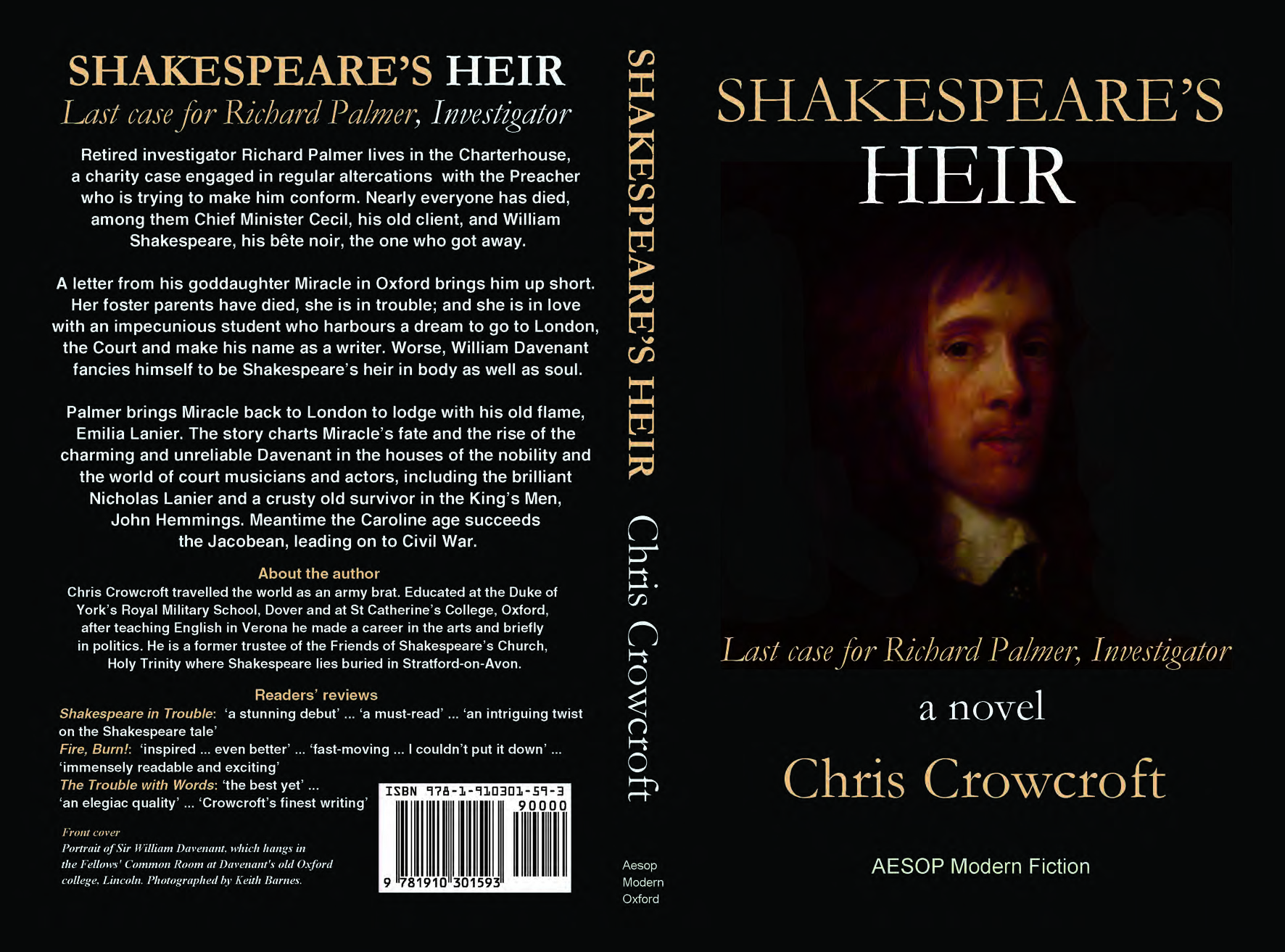 an excellent, often moving historical novel... Crowcroft’s deep knowledge of the period is always lightly and entertainingly handled. Less of an “investigation” than the previous books, Shakespeare’s Heir is Richard Palmer trying to make sense of his own life and to understand the part that Shakespeare played in it. While the secondary characters, and indeed William Davenant himself will hardly be familiar to the average reader it is probably best to give yourself a real treat and read the four books in order. We are guided skilfully through the network of historical events and characters. Palmer is the kind of antihero I like: sardonic, with a romantic soft-centre. Crowcroft says goodbye to his character in a novel which allows us to observe the great events of the time. The humour of the previous books remains, even as the final chapter brought a certain moistness to even these cynical eyes. Crowcroft knows his stuff but even better he knows how to tell it. Well recommended!